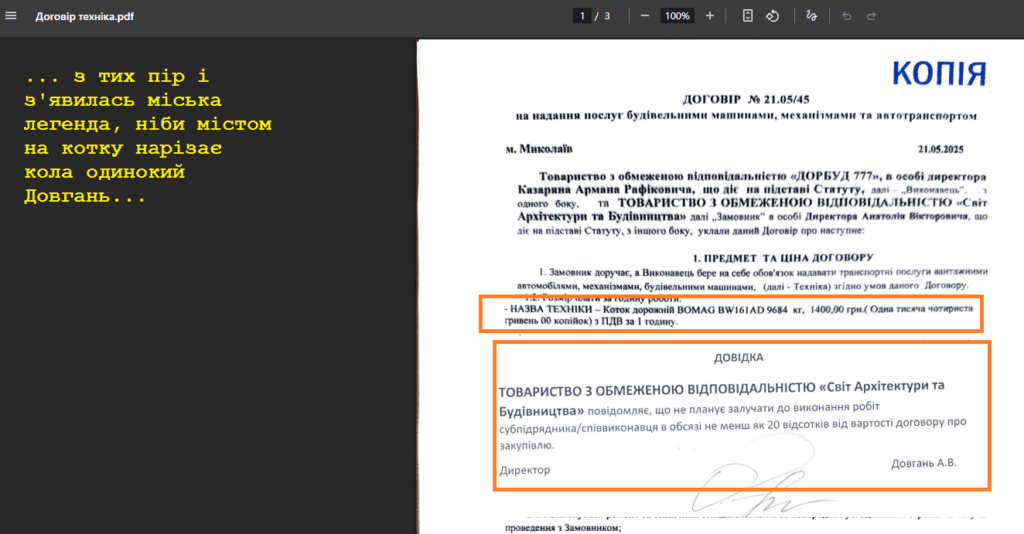 А ще Довгань говорить про те, що орендуватиме коток дорожній у ТОВу “ДОБРОБУД 777” по 1400 гривень за годину. Тому, коли побачите на набережній Миколаєва одинокого вершника котка Bomag BW161AD – не полінуйтесь і привітайтесь, бо йому одному ремонтувати досить важко.