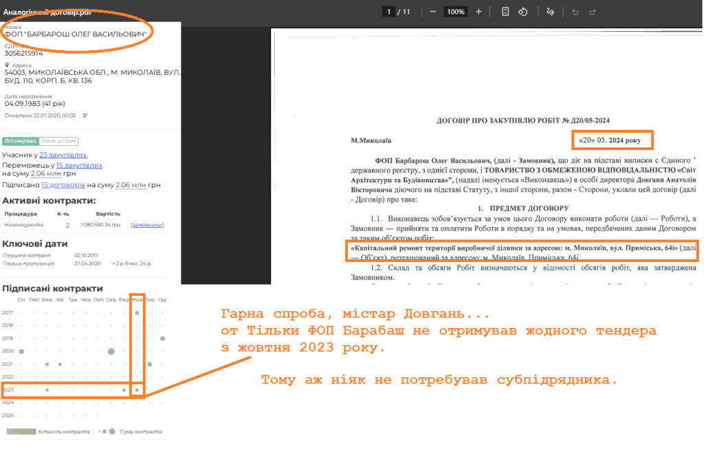 Пан (він же і є цілий ТОВ) подає довідку з аналогічним досвідом, ніби ФОП Барабаш Олег Васильович ще в травні 2024 року найняв ТОВку на ремонт ділянки по вул. Приміська 64і. Тобто найняв “нулячу ТОВку” через місяць після її реєстрації. Ну ви серйозно? Тим більше, що ФОП Барабаш жодних договорів у Prozorro з жовтня 2023 року і сам не отримував. Ну не міг же він ні з того ні з цього почати робити ремонт ділянки без доручення місцевої влади, чи не так?