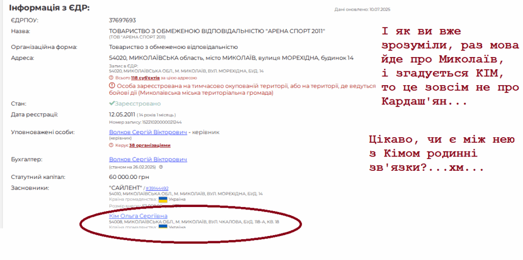 Ольга Кім вийшла з ТОВу “АРЕНА СПОРТ МИКОЛАЇВ” в жовтні 2021 року, а ще в далекому 2015 році з неї вийшов Кім Віталій Олександрович.