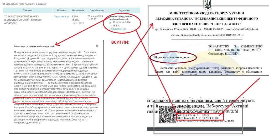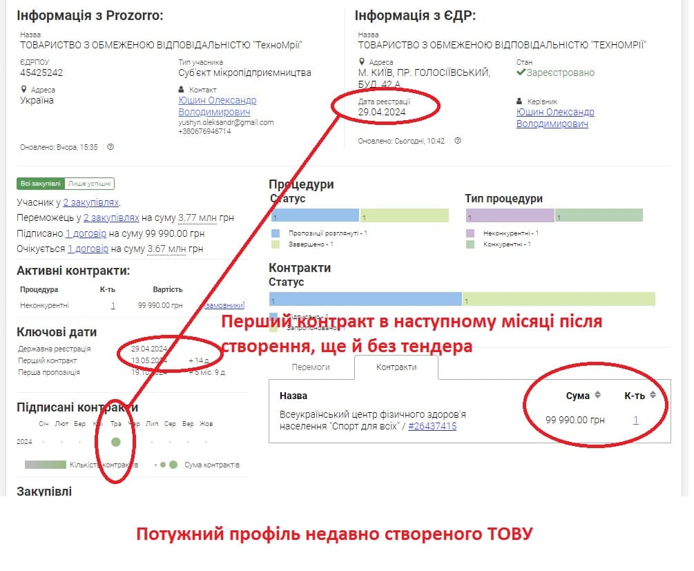 Переможцем на торгах став ТОВ “ТехноМрії” (3 669 780 гривень). ТОВка створена 4 місяці тому, 29 квітня. Має 3 000 гривень статутного капіталу. Через два тижні після створення отримує “безтендерно” перший контракт на 100 тисяч гривень від Всеукраїнського центру фізичного здоров’я населення “Спорт для всіх”.