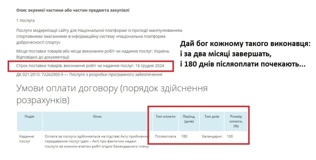 21 жовтня Міністерство молоді та спорту України провело закупівлю коштом державного бюджету (спецрахунок) на “Послуги з розробки програмного забезпечення : Модернізації сайту для Національної платформи із протидії маніпулюванням спортивними змаганнями в інформаційну систему “Національна платформа доброчесності спорту” вартістю 3 946 000 гривень.
