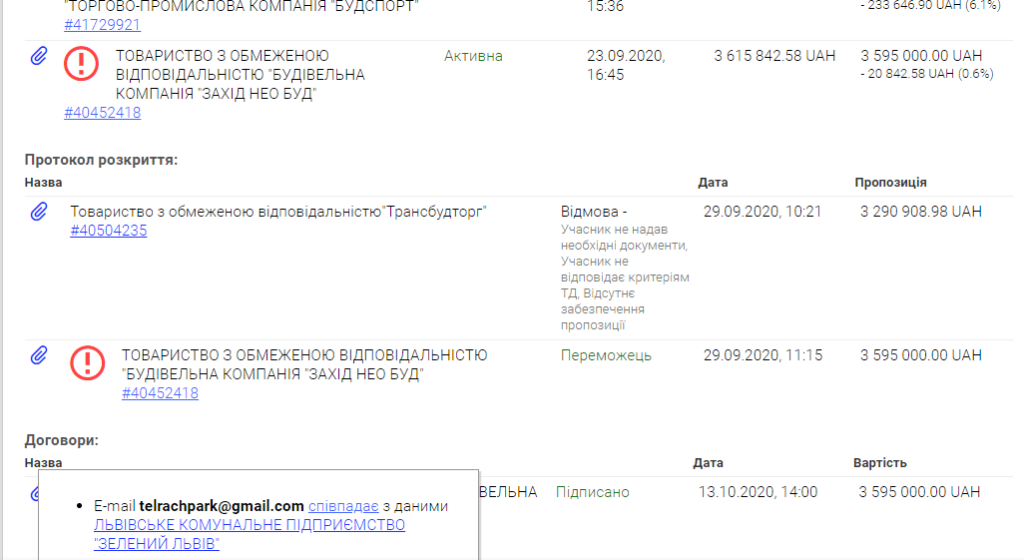 “ЗАХІД НЕО БУД” має 130 контрактів на понад 369 мільйонів. З даним замовником має лише 3 контракти на 6 мільйонів гривень. Але ризик-фактори у системі Clarity Project вказують на те, що у замовника і “переможця” однакова електронна пошта, що може свідчити про те, що учасники між собою пов’язані.