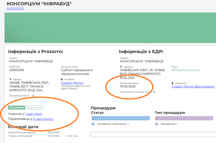 Консорціум створений 19 травня 2025 року трьома засновниками: АТ “ЗАКРИТИЙ НЕДИВЕРСИФІКОВАНИЙ ВЕНЧУРНИЙ КОРПОРАТИВНИЙ ІНВЕСТИЦІЙНИЙ ФОНД “МЕРКУРІ”, ТОВом “БУДГРУПСЕРВІС” та ТОВом “ГАЛИЦЬКА БУДІВЕЛЬНА ГІЛЬДІЯ”. Досі контрактів у Prozorro не мав.
