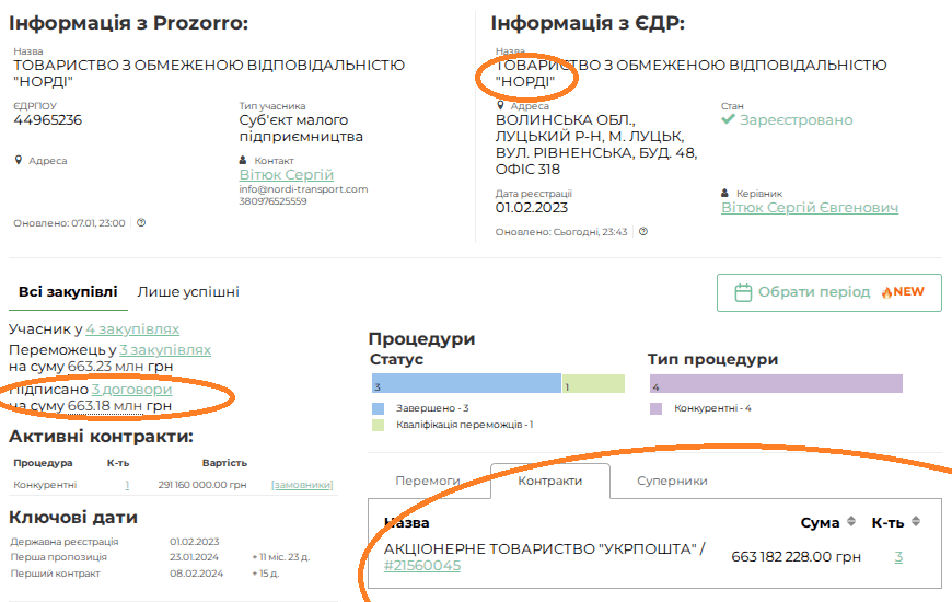 ТОВ існує з 2023 року, знаходиться в Луцьку. Має 3 договори на 663 мільйони гривень. Працює лише з “УКРПОШТОЮ”.