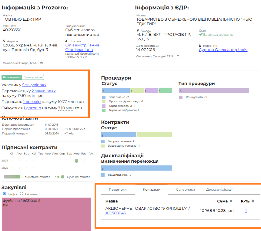 ТОВ існує з 2016 року. Має 1 договір на 10 мільйонів гривень, який отримав лише в жовтні 2024 року. Він також на футболки і теж – з “УКРПОШТОЮ”.