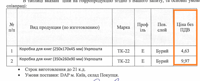 3 серпня АКЦІОНЕРНЕ ТОВАРИСТВО “УКРПОШТА” провело закупівлю на коробки для книг. Очікувана вартість закупівлі склала 4 266 120 гривень. За цю суму хочуть отримати 700 000 коробок, розміром 250х170х45 мм та 18 000 коробок розміром 350х260х90 мм.