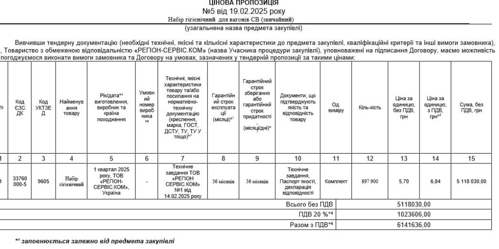 20 лютого ФІЛІЯ “ПАСАЖИРСЬКА КОМПАНІЯ” АКЦІОНЕРНОГО ТОВАРИСТВА “УКРАЇНСЬКА ЗАЛІЗНИЦЯ” провела закупівлю на набір гігієнічний для вагонів СВ (звичайний). Очікувана вартість 897900 комплектів склала 7 183 200 гривень.