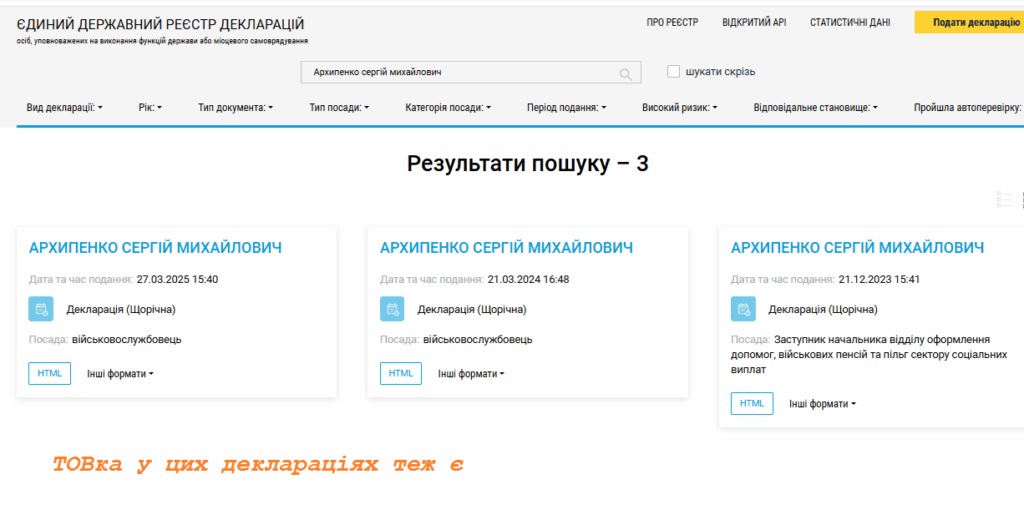 А знаєте, чого немає у Архипенка? Детальної інформації в усіх поданих деклараціях хоча б якогось натяку на місце проживання: не має власного житла і не орендує. Останніми роками подає декларації як просто “військовослужбовець”, хоча ще за 2022 рік подавав як Заступник начальника відділу оформлення допомог, військових пенсій та пільг сектору соціальних виплат (КИЇВСЬКИЙ ОБЛАСНИЙ ВІЙСЬКОВИЙ КОМІСАРІАТ).