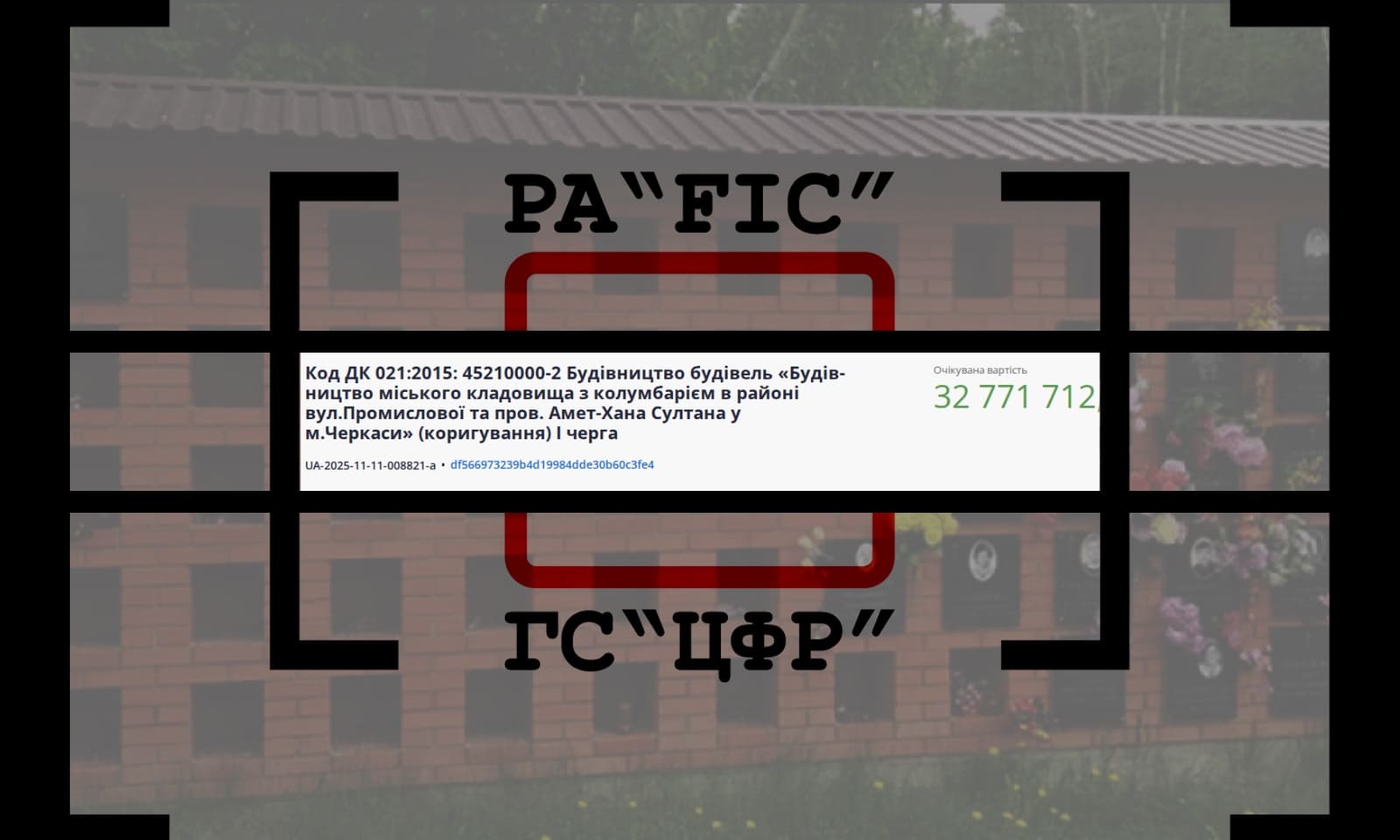 26 листопада ДЕПАРТАМЕНТ ЖИТЛОВО-КОМУНАЛЬНОГО КОМПЛЕКСУ ЧЕРКАСЬКОЇ МІСЬКОЇ РАДИ провів закупівлю на будівництво міського кладовища з колумбарієм в районі вул. Промислової та пров. Амет-Хана Султана у м. Черкаси. (Коригування) І черга.