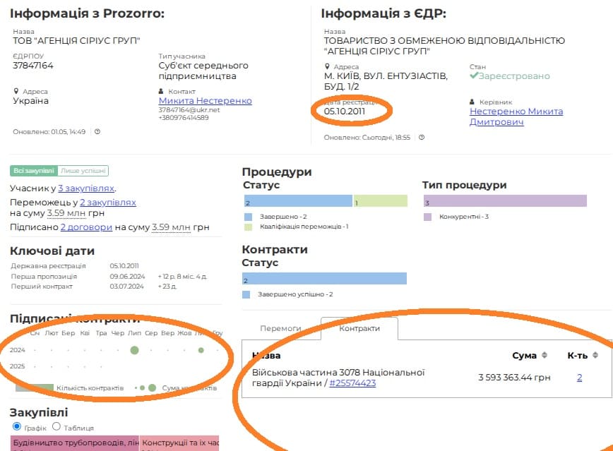 ТОВ існує з 2011 року, але має лише 2 перемоги на торгах на 3,5 мільйона гривень. Обидві – у липні та листопаді 2024 року (ВЧ 3078).