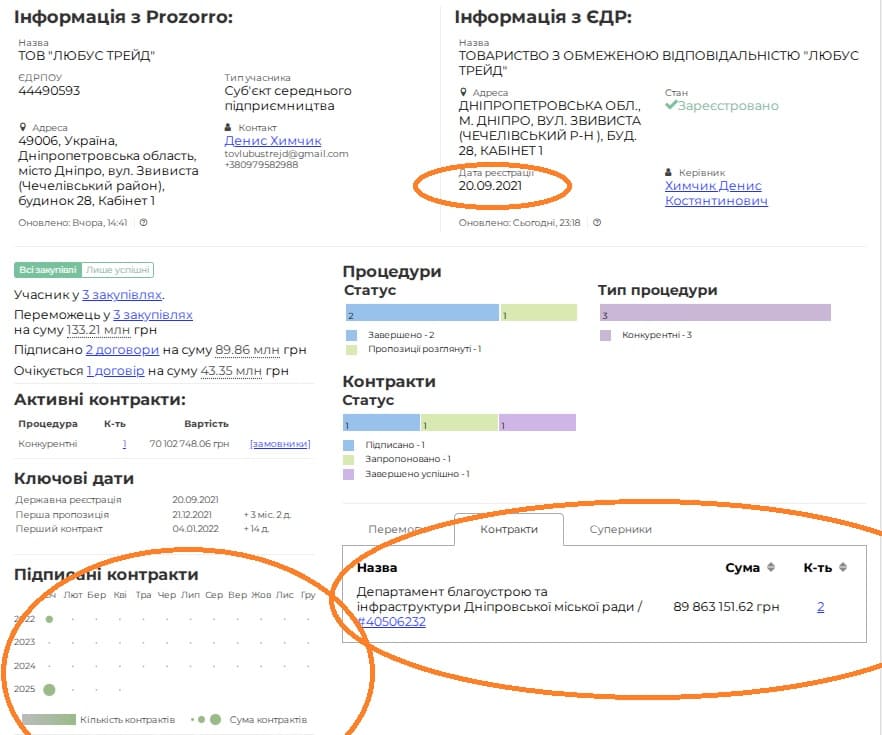 ТОВ створений у 2021 році. Має 2 договори на 89 мільйонів гривень. Обидва контракти підписані з одним і тим же, вище згаданим замовником (у 2022 році та 2025 року).
