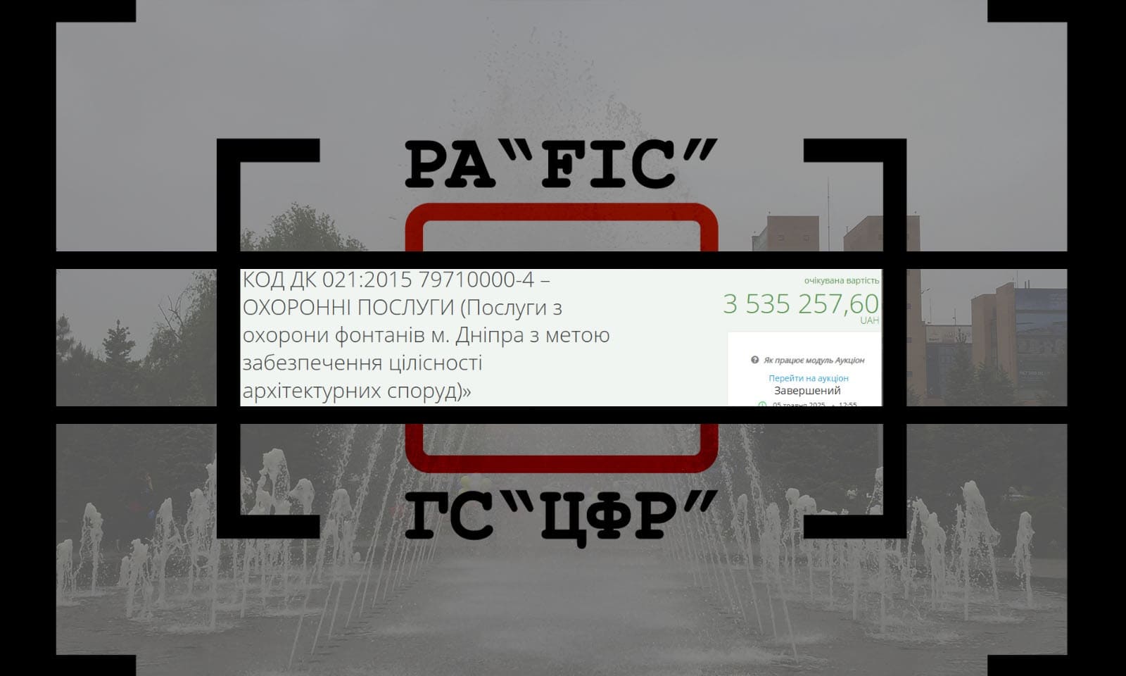 5 травня КОМУНАЛЬНЕ ПІДПРИЄМСТВО “ДНІПРОВОДОКАНАЛ” ДНІПРОВСЬКОЇ МІСЬКОЇ РАДИ провело закупівлю на послуги охорони фонтанів м. Дніпра з метою забезпечення цілісності архітектурних споруд. Очікувана вартість закупівлі склала 3 535 257,6 гривні (кошти від господарської діяльності підприємства).