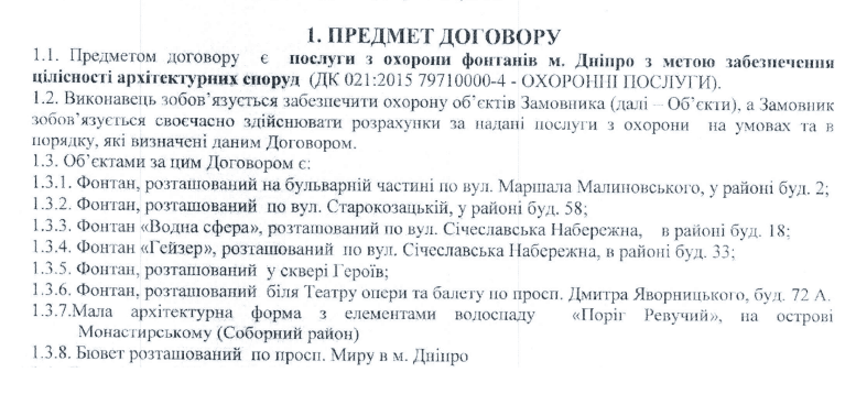 5 травня КОМУНАЛЬНЕ ПІДПРИЄМСТВО “ДНІПРОВОДОКАНАЛ” ДНІПРОВСЬКОЇ МІСЬКОЇ РАДИ провело закупівлю на послуги охорони фонтанів м. Дніпра з метою забезпечення цілісності архітектурних споруд. Очікувана вартість закупівлі склала 3 535 257,6 гривні (кошти від господарської діяльності підприємства).