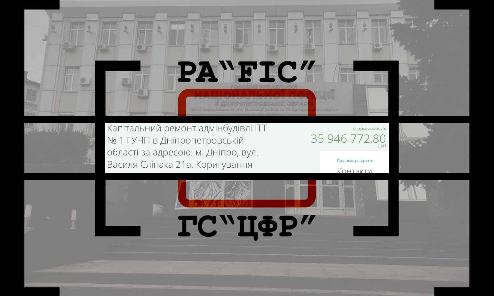 2 липня Головне управління Національної поліції в Дніпропетровській області провело закупівлю на капітальний ремонт адмінбудівлі ІТТ № 1 ГУНП в Дніпропетровській області за адресою: м. Дніпро, вул. Василя Сліпака 21а. Коригування. Очікувана вартість закупівлі склала 35 946 772,8 гривні.