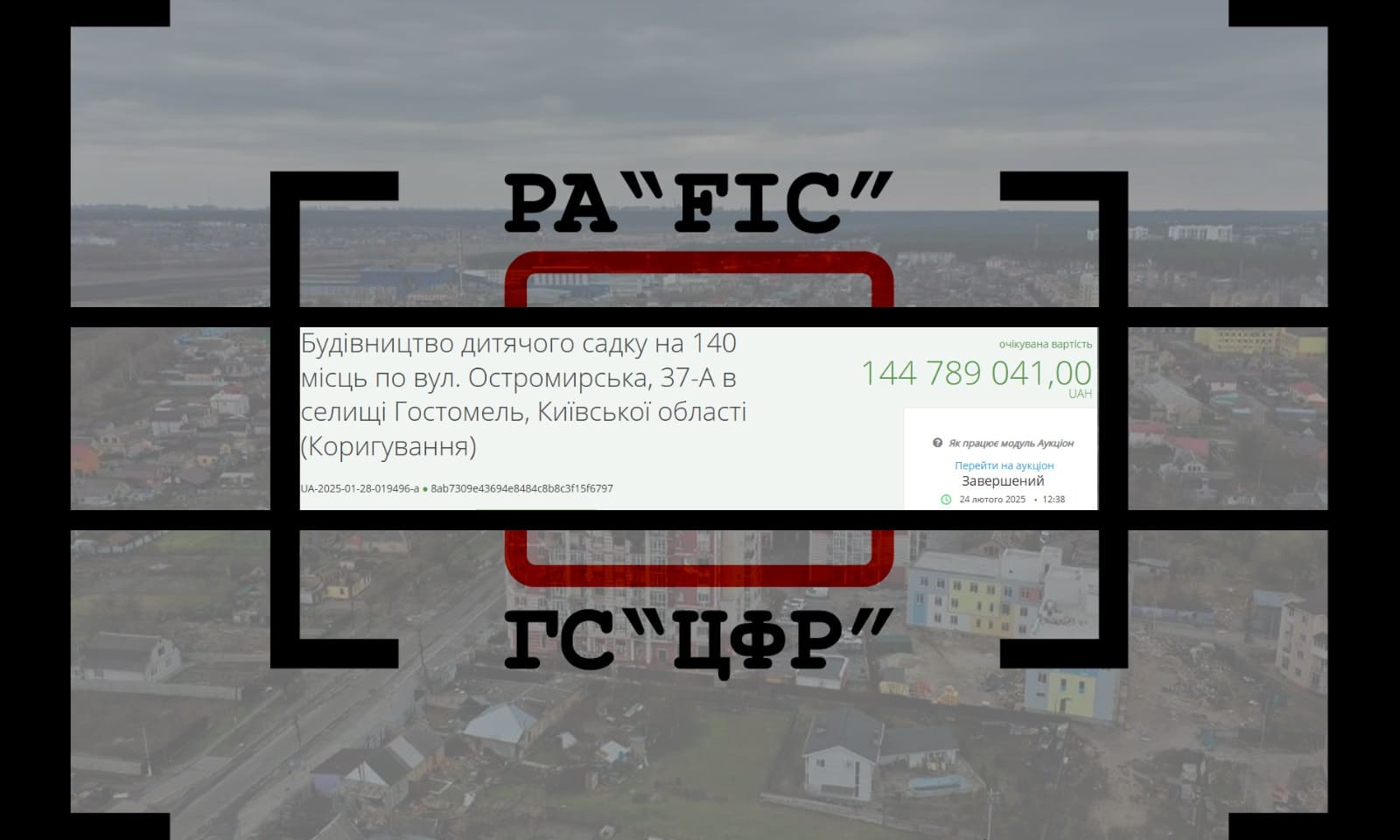 24 лютого Департамент регіонального розвитку Київської обласної державної адміністрації провів закупівлю на будівництво дитячого садку на 140 місць по вул. Остромирська, 37-А в селищі Гостомель, Київської області (Коригування). Очікувана вартість закупівлі склала 144 789 041 гривню (120 657 534 гривні – кошти ЄІБ щодо реалізації Програми з відновлення України та 24 131 506,83 гривні з місцевого бюджету).