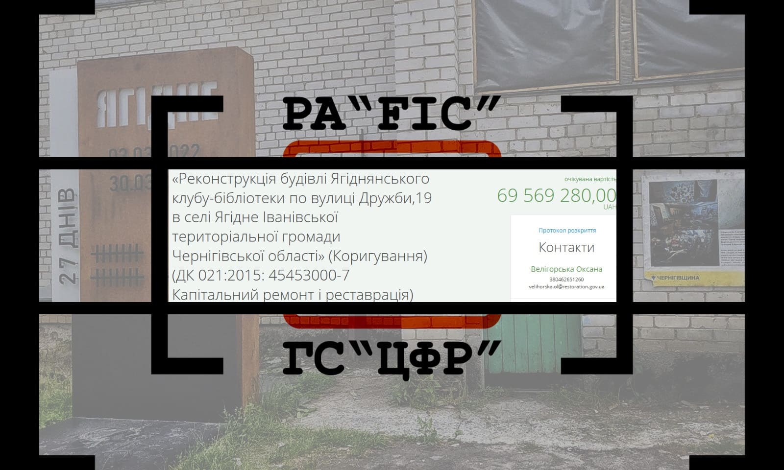 9 липня Служба відновлення та розвитку інфраструктури у Чернігівській області провела закупівлю на реконструкцію будівлі Ягіднянського клубу-бібліотеки по вулиці Дружби,19 в селі Ягідне Іванівської територіальної громади Чернігівської області (Коригування).
