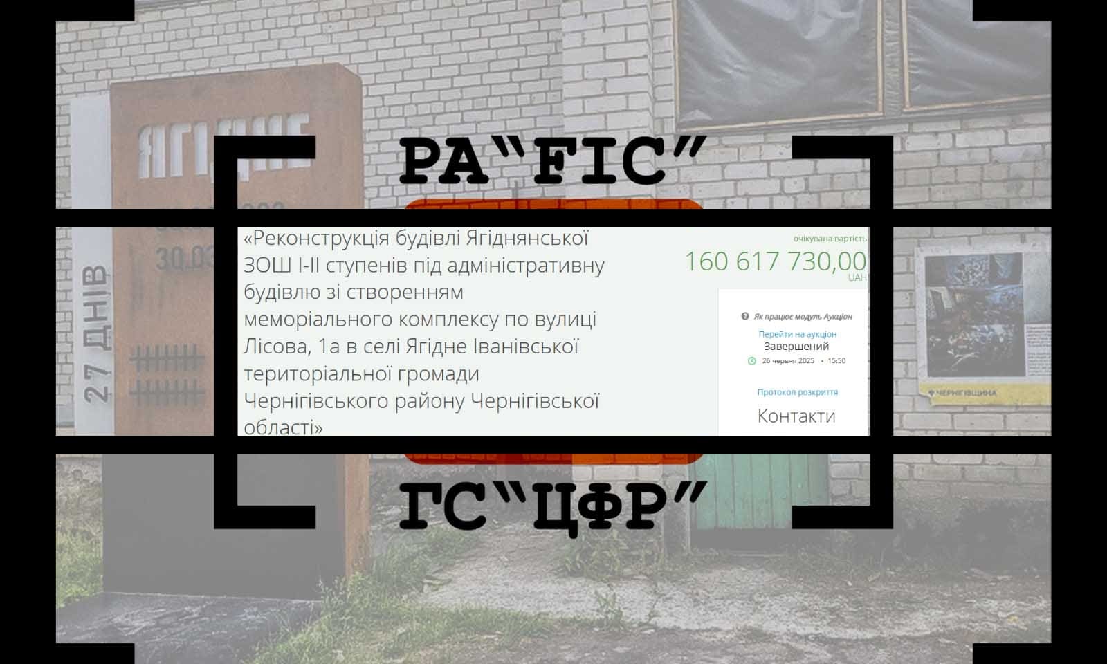26 червня Служба відновлення та розвитку інфраструктури у Чернігівській області провела закупівлю на реконструкцію будівлі Ягіднянської ЗОШ I-II ступенів під адміністративну будівлю зі створенням меморіального комплексу по вулиці Лісова, 1а в селі Ягідне Іванівської територіальної громади Чернігівського району Чернігівської області.