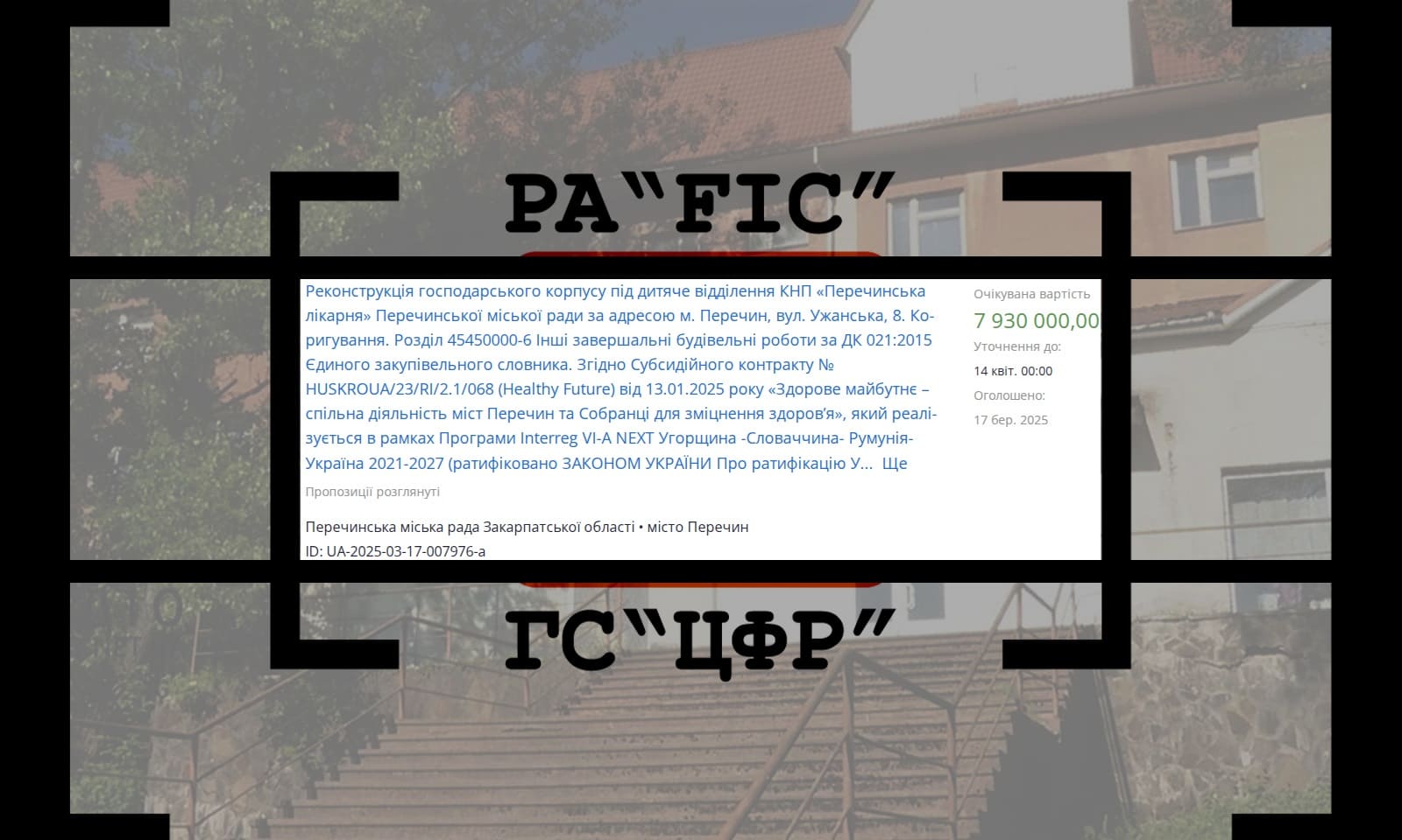 17 квітня Перечинська міська рада Закарпатської області провела закупівлю на реконструкцію господарського корпусу під дитяче відділення КНП “Перечинська лікарня” Перечинської міської ради за адресою м. Перечин, вул. Ужанська, 8. (Коригування).