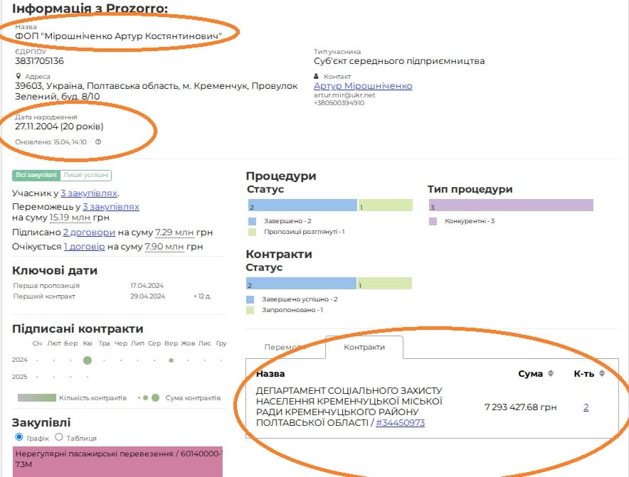 ФОП зареєстрований в березні 2024 року (власник ФОПу 2004 року народження). Має два контракти на 7 мільйонів гривень. Працює лише з одним єдиним, згаданим вище, замовником.