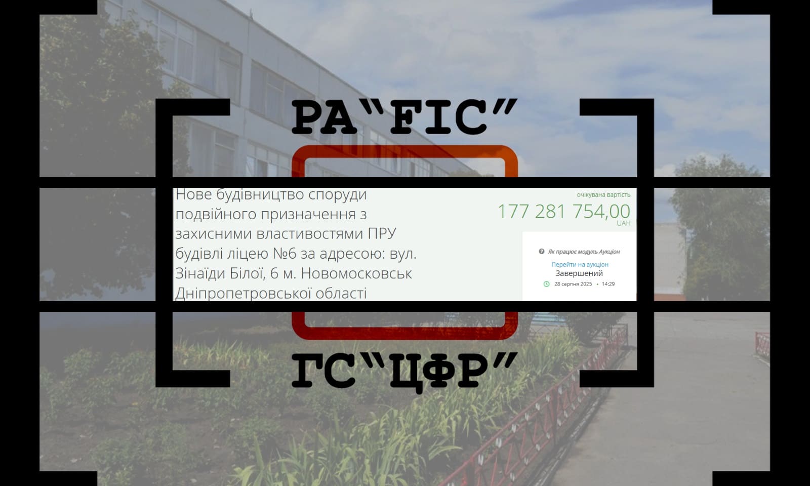 28 серпня УПРАВЛІННЯ ЖИТЛОВО-КОМУНАЛЬНОГО ГОСПОДАРСТВА ТА КАПІТАЛЬНОГО БУДІВНИЦТВА САМАРІВСЬКОЇ МІСЬКОЇ РАДИ провело закупівлю на нове будівництво споруди подвійного призначення з захисними властивостями ПРУ будівлі ліцею №6 за адресою: вул. Зінаїди Білої, 6.