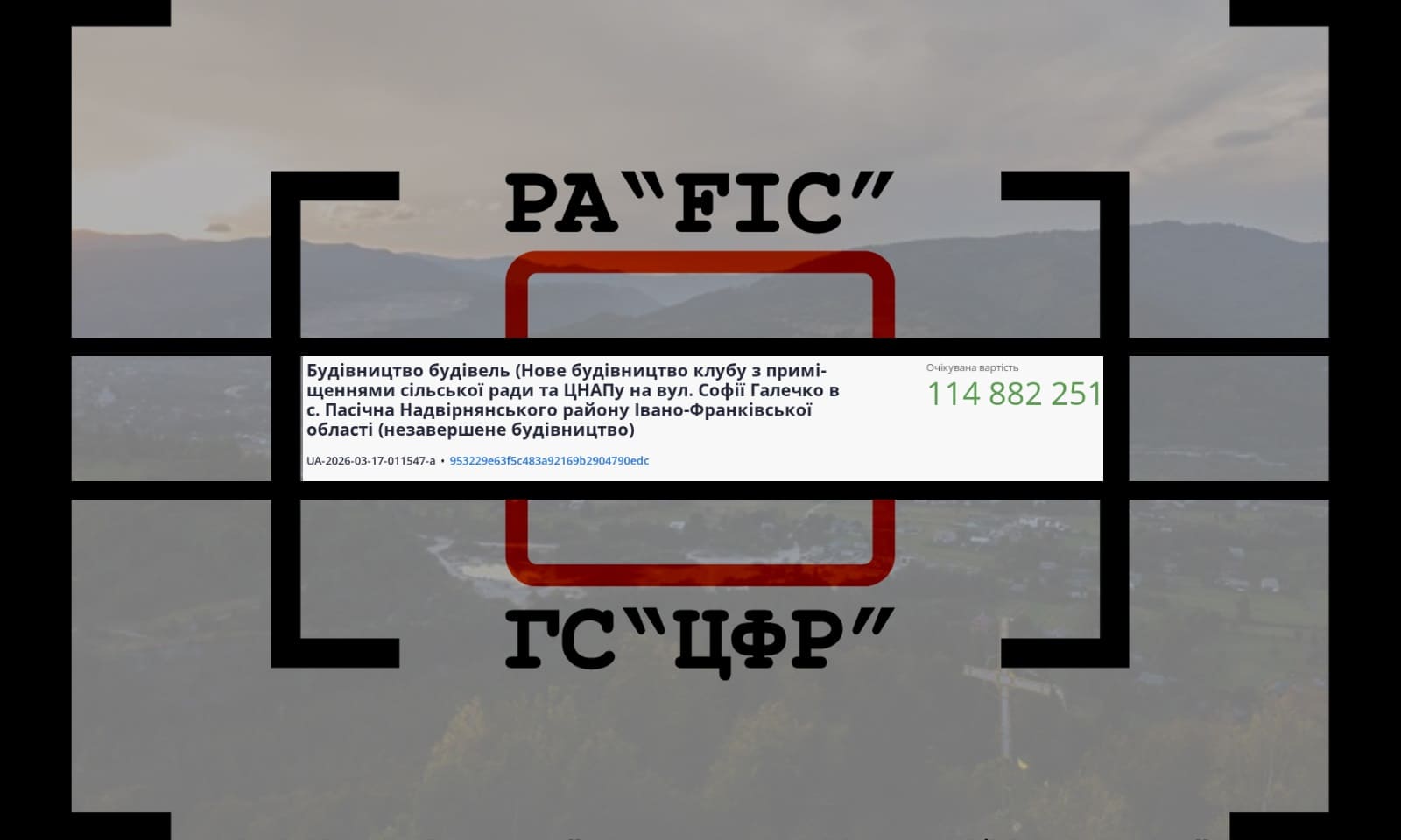 2 квітня ПАСІЧНЯНСЬКА СІЛЬСЬКА РАДА провела закупівлю на нове будівництво клубу з приміщеннями сільської ради та ЦНАПу на вул. Софії Галечко в с. Пасічна Надвірнянського району Івано-Франківської області (незавершене будівництво).