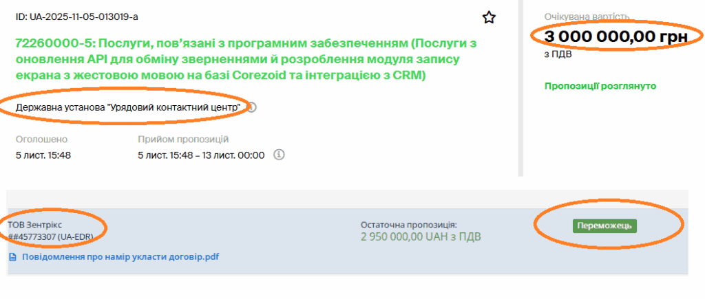 13 листопада Державна установа “Урядовий контактний центр” провела закупівлю на послуги з оновлення API для обміну зверненнями й розроблення модуля запису екрана з жестовою мовою на базі Corezoid та інтеграцією з CRM. За 3 мільйони гривень.