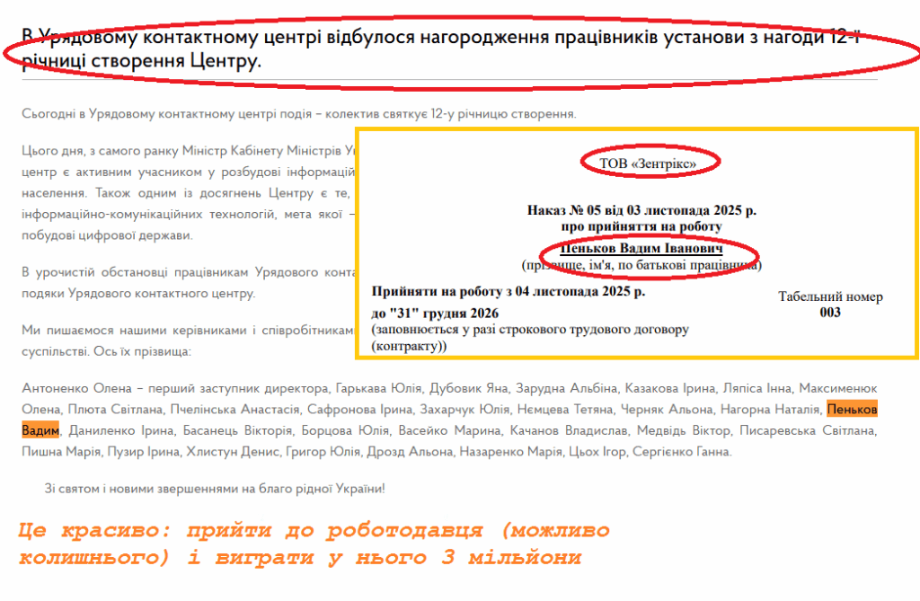 І останнє, що хотіли б додати. У цій новій, найсвіжішій компанії Зенкіна, у ТОВі “Зентрікс”, як ми вже повідомили вище – 3 працівники. Один з них Вадим Пеньков. У далекому довоєнному 2021 році його згадали, як “передового працівника” Урядового контактного центру з нагоди 12-річчя існування цього ж центру.