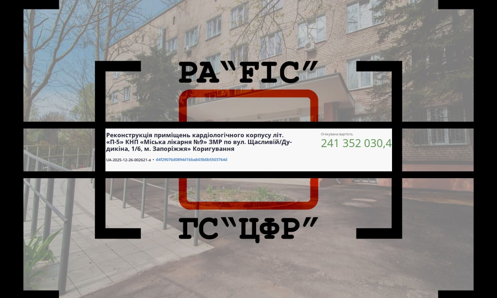 17 січня Департамент з питань охорони здоров’я та медичного забезпечення Запорізької міської ради провів закупівлю на реконструкцію приміщень кардіологічного корпусу літ. “П-5” КНП “Міська лікарня №9” ЗМР по вул. Щасливій/Дудикіна, 1/6, м. Запоріжжя» Коригування.
