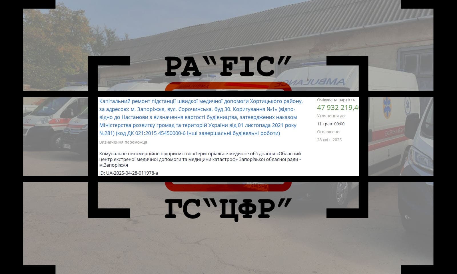 14 травня Комунальне некомерційне підприємство “Територіальне медичне об’єднання “Обласний центр екстреної медичної допомоги та медицини катастроф” Запорізької обласної ради провів закупівлю на капітальний ремонт підстанції швидкої медичної допомоги Хортицького району, за адресою: м. Запоріжжя, вул. Сорочинська, буд 30. Коригування №1.