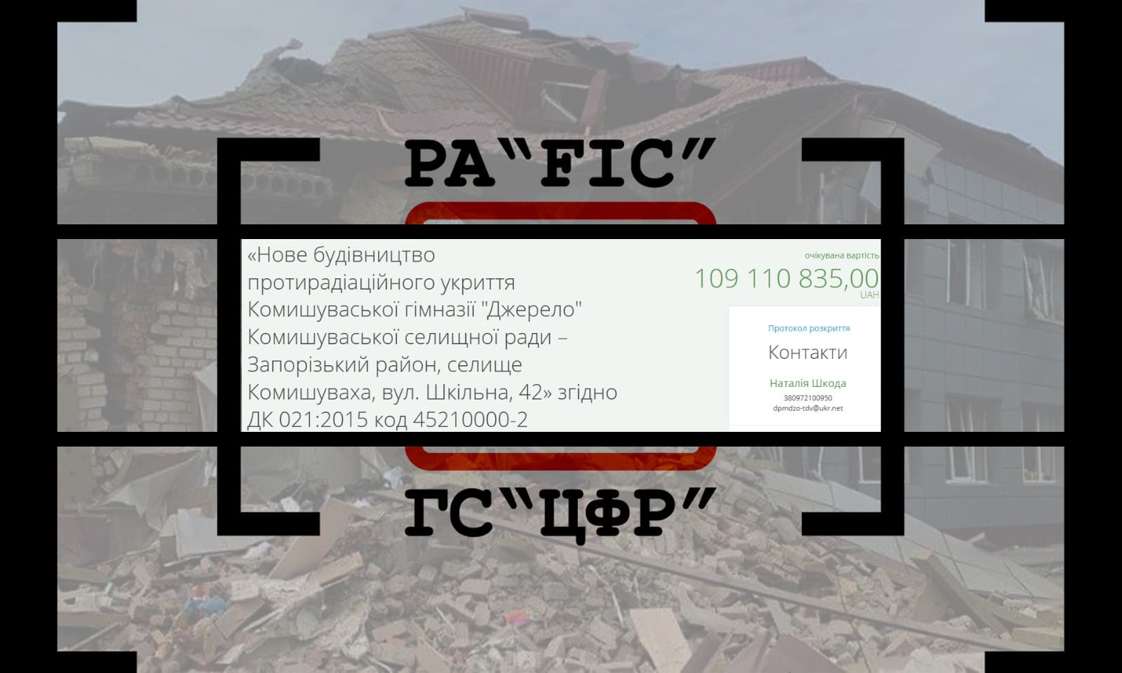 29 січня ДЕРЖАВНЕ ПІДПРИЄМСТВО “МІСЦЕВІ ДОРОГИ ЗАПОРІЗЬКОЇ ОБЛАСТІ” провело закупівлю на нове будівництво протирадіаційного укриття Комишуваської гімназії “Джерело” Комишуваської селищної ради – Запорізький район, селище Комишуваха. Очікувана вартість закупівлі склала 109 110 835 гривень (місцевий бюджет).