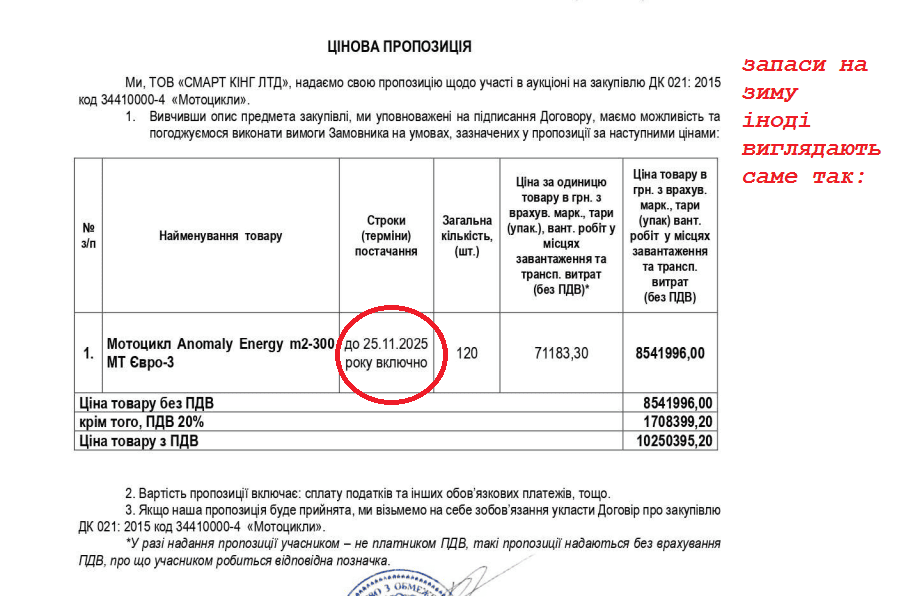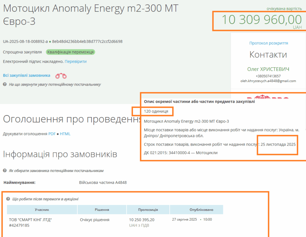 27 серпня Військова частина А4848, що базується у Дніпропетровській області, провела закупівлю на мотоцикли Anomaly Energy m2-300 МТ Євро-3 за 10 309 960 гривень.