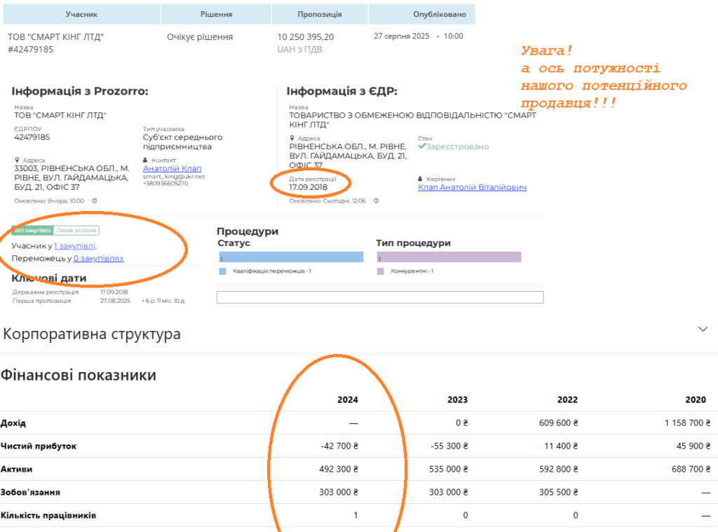 ТОВ знаходиться в Рівному. Існує з 2018 року. Статутний капітал має у 10 000 гривень (це як та сума, на яку він продав байки, але нулів менше). Раніше не мав жодного продажу в системі Prozorro. Нуль. Вже 7 років – нуль.