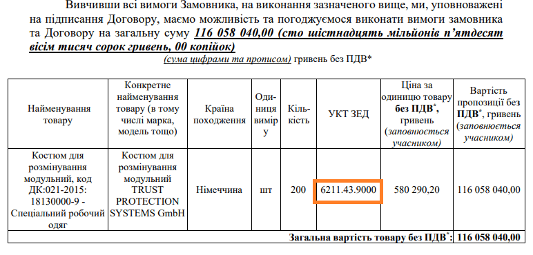 12 червня Військова частина Т0950 провела закупівлю на костюми для розмінування модульні, очікуваною вартістю у 116 058 040 гривень.