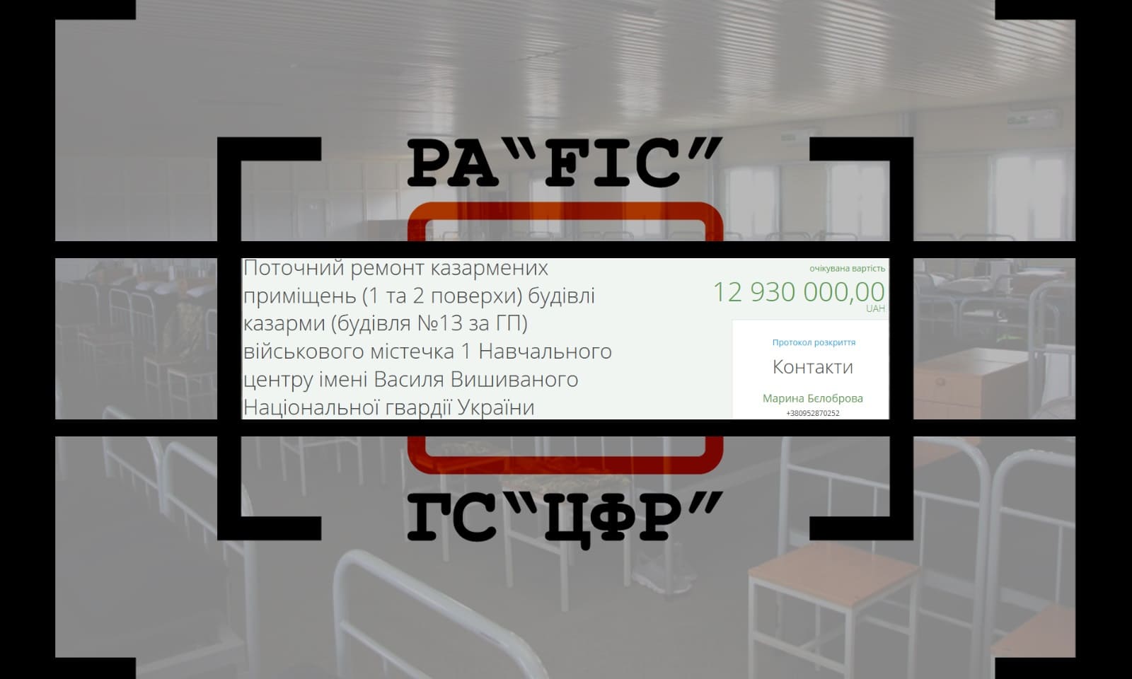 12 лютого Навчальний центр імені Василя Вишиваного Національної гвардії України (військова частина 3007) провів закупівлю на поточний ремонт казармених приміщень (1 та 2 поверхи) будівлі казарми (будівля №13 за ГП) військового містечка 1.