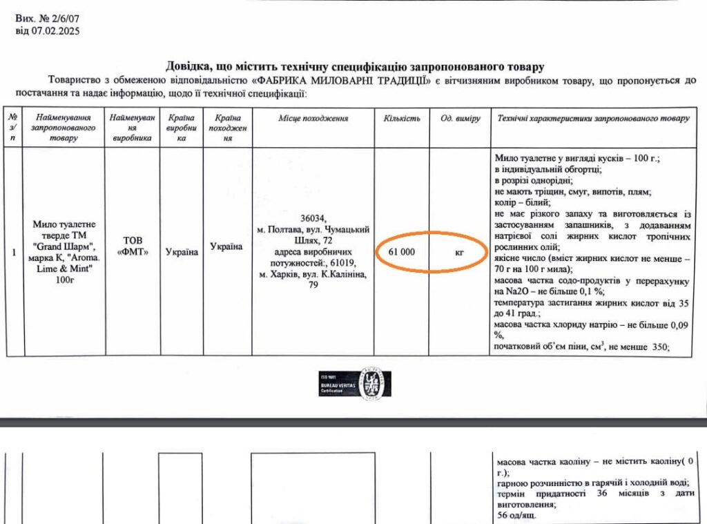 Термін поставки 64 000 кілограмів мила очікують до 1 травня 2025 року.