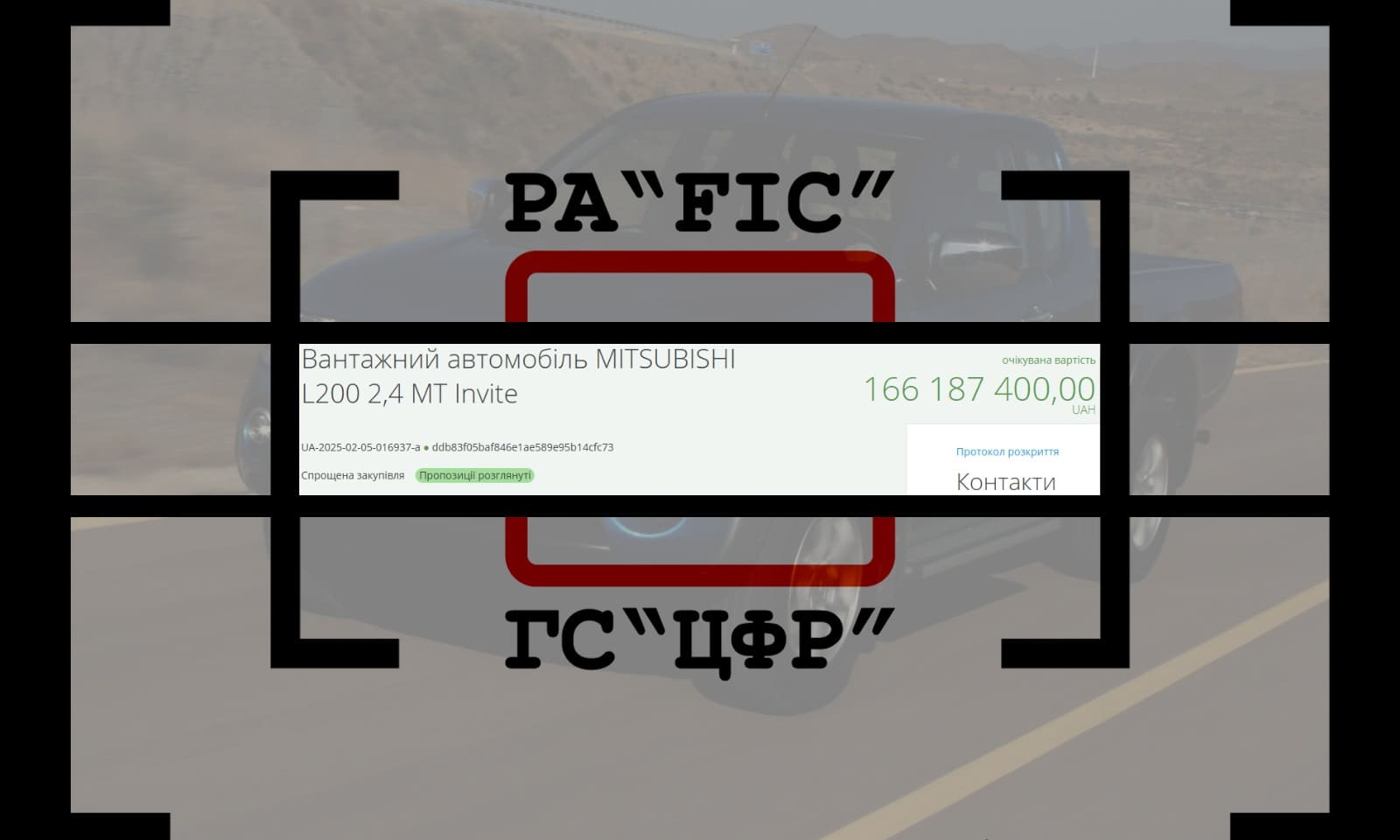 17 лютого Військова частина А4118 провела закупівлю на 100 вантажних автомобілів MITSUBISHI L200 2,4 MT Invite. Очікувана вартість закупівлі скала 166 187 400 гривень.