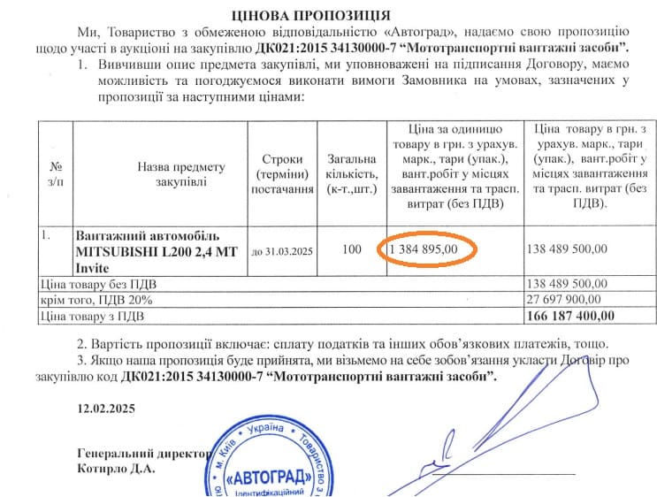 17 лютого Військова частина А4118 провела закупівлю на 100 вантажних автомобілів MITSUBISHI L200 2,4 MT Invite. Очікувана вартість закупівлі скала 166 187 400 гривень.