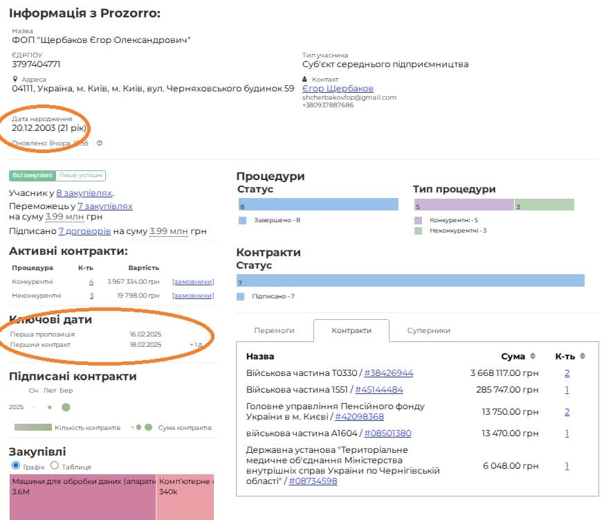 21-й ФОП зареєстрований 30 січня 2025 року. В лютому отримав уже перший контракт, зараз має 7 договорів на 3 мільйони з п’ятьма замовниками.