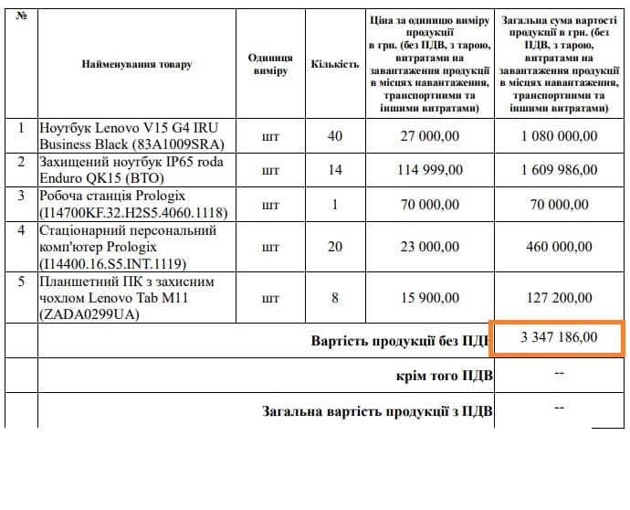 18 березня Військова частина Т0330 провела закупівлю на ноутбуки, робочу станцію, стаціонарний ПК, планшетний ПК з захисним чохлом. Очікувана вартість закупівлі склала 3 347 212 гривень.
