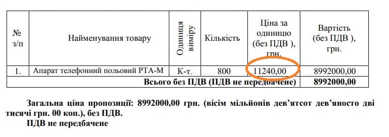 26 березня Військова частина 2428 провела закупівлю на польові телефони. 800 комплектів мають намір придбати за 9 859 200 гривень.