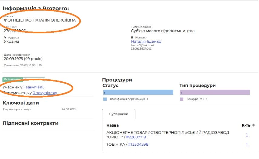 ФОП зареєстрований 4 листопада 2024 року у Вінниці. Досі не має жодного контракту в Prozorro.