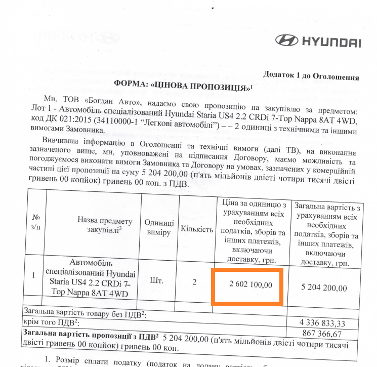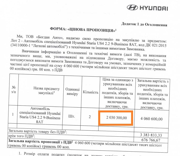 Закупівля була розділена на два лоти: 2 Hyundai Staria US4 2.2 CRDi 7-Top Nappa 8AT 4WD та 2 Hyundai Staria US4 2.2 9-Business 8AT. Переможцем у обох випадках став ТОВ “БОГДАН АВТО”.