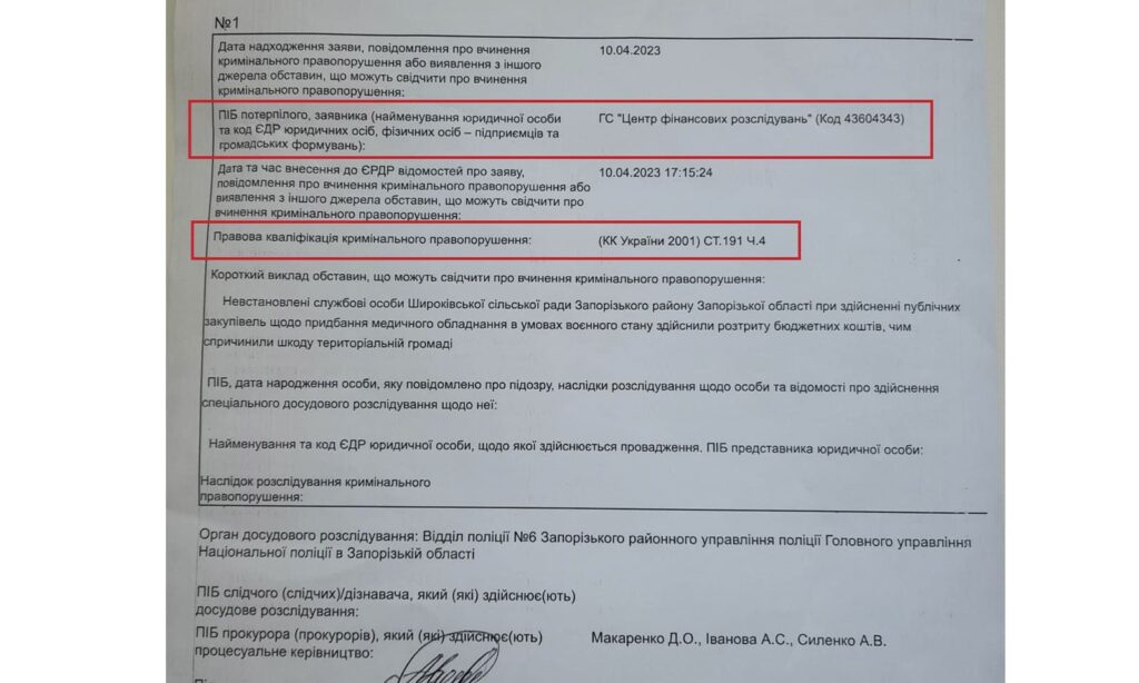 Спочатку ми звернулися до Запорізької обласної прокуратури, але, як виявилося, «не той абонент». Наше звернення було перенаправлено до Запорізької окружної прокуратури, а вже згодом нам прийшов «лист щастя»: 11 квітня відомості були внесені до Єдиного реєстру досудових розслідувань з попередньою кваліфікацією за ч.4. ст191 ККУ.