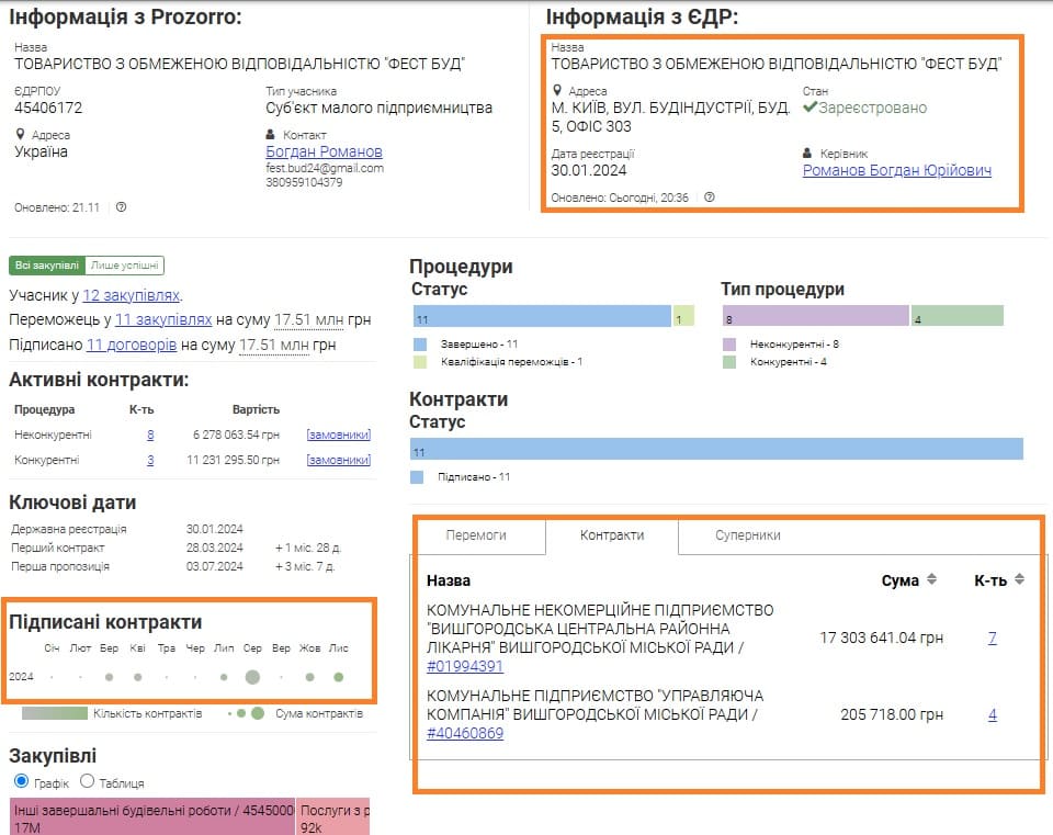 ТОВ створений у 2024 році (9 місяців тому). Має 11 контрактів на 17 мільйонів гривень. Працює виключно з двома замовниками у Вишгороді. З лікарнею має 7 договорів на 17 мільйонів гривень.