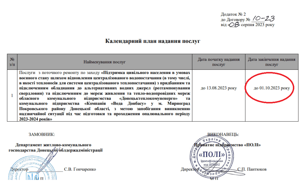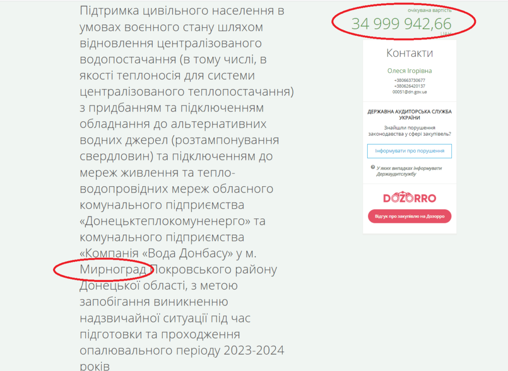 Ціна питання 34 999 942,66 гривні. Дана потреба на 100% покривається коштами місцевого бюджету. Переможцем стає приватне підприємство “Поллі”. Для нашої організації це здалось абсолютно очікуваним. Але, також, ми можемо спрогнозувати наступне: зі свердловинами у Мирнограді проблеми будуть, не дивлячись на те, що роботи планують завершити 1 жовтня 2023 року.