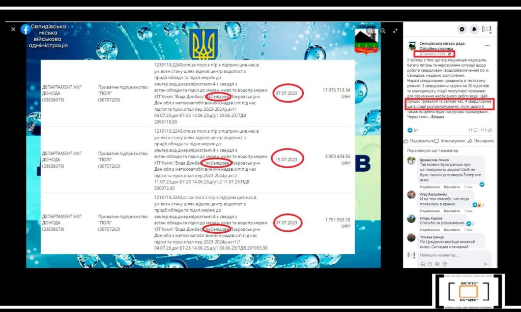 20 липня об 11:24 на офіційній сторінці Селидівської міської ради у Facebook з’являється непереконливе пояснення про те, чому продовжуються проблеми з водою у місті, де здійснюється підвіз води, а також, що 4 свердловини знаходяться “в стадії розтампонування”.