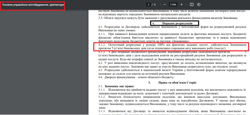 До речі, замовник частково сплатив виконавцю робіт за послуги, це можна відстежити у відкритих джерелах інформації. А цей факт напряму суперечить умовам договору, де 100% вартості сплачується замовником протягом 5 днів після підписання акту виконаних робіт, послуг.