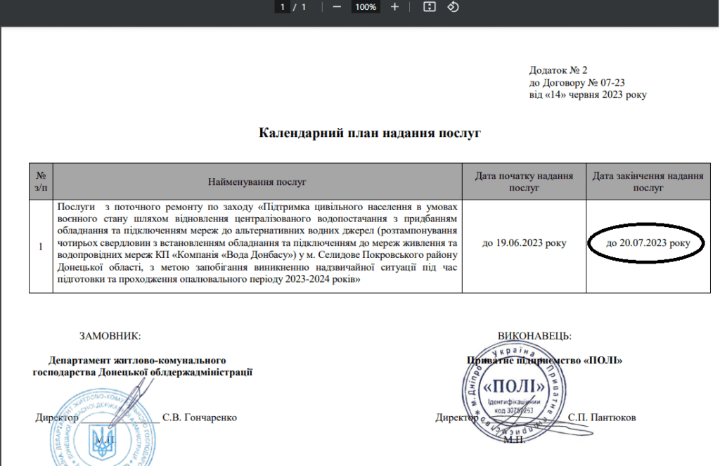 Напевне, жителям прифронтового міста важко щодня моніторити Prozorro, бо якби вони цим займались, то знайшли б оцю закупівлю бюджетом у 25 мільйонів на свердловини з граничним терміном виконання робіт: 20 липня. Тобто, за планом, всі 4 свердловини у місті мали б працювати станом на 20 липня. Натомість місцеві пабліки подібну інформацію спростовують.
