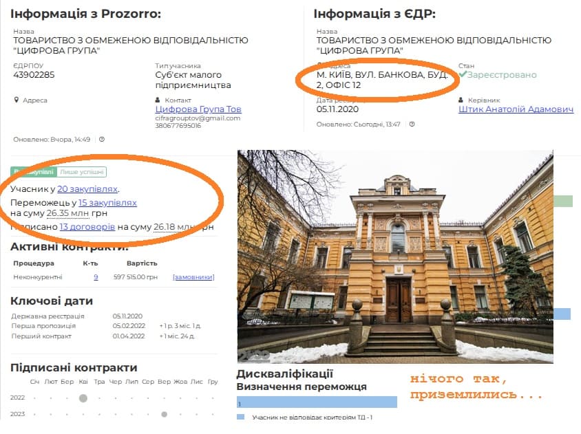 На тендер для військової частини, ця ТОВка прийшла без підтвердження матеріально-технічної бази, наказів на роботу працівників, довідки про наявність працівників, без договорів оренди на будь-що. Тобто, без жодного підтвердження, що є у них можливість доставити 200 ноутбуків у червні до ВЧ.