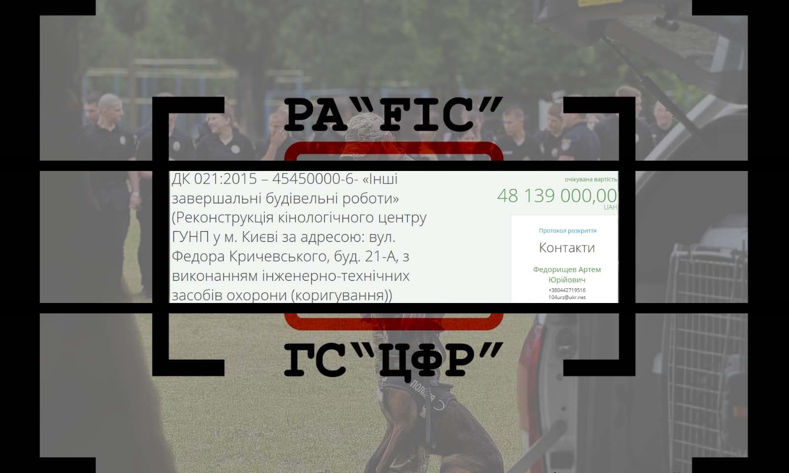 13 серпня Головне управління Національної поліції у місті Києві провело закупівлю на реконструкцію кінологічного центру ГУНП у м. Києві з виконанням інженерно-технічних засобів охорони (коригування)).